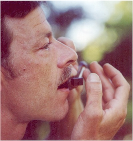 Hold the Clackamore as shown, resting your thumb and forefinger against your cheek while grasping opposing sides of the instrument neck. With the instrument lightly touching your lips, tap the reed with the extended fingers of your free hand. To play different notes, change the size and shape of your mouth cavity by silently mouthing the letter “A” and “E”. With a little practice, these pitch variations can be controlled to permit the playing of melodies. Experimentation will reveal the many different sounds and rhythms you can play with your Clackamore.